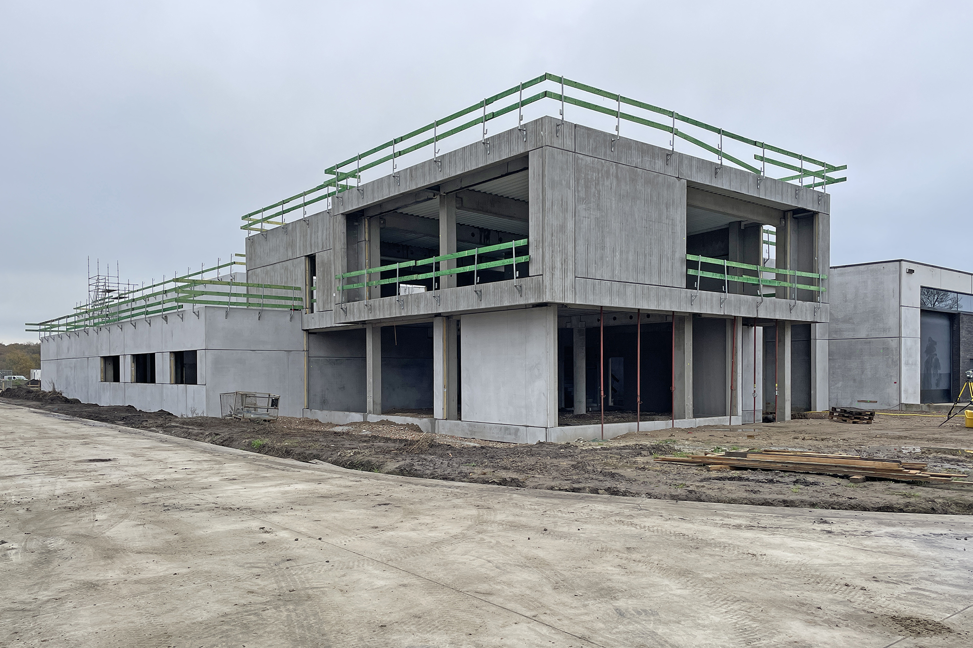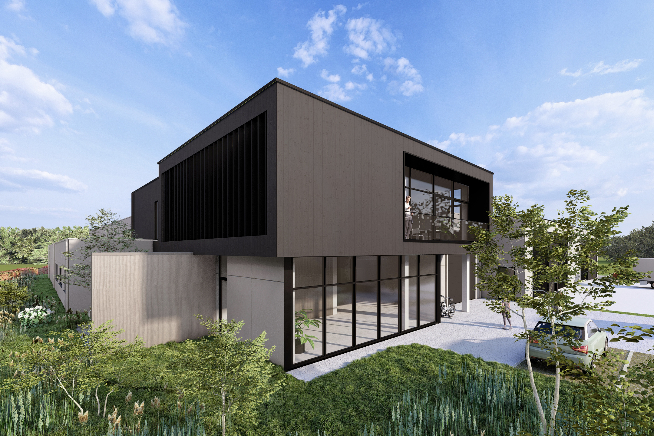 De kop van het gebouw, waar op het gelijkvloers de ontvangstruimte en op de verdieping de kantoorruimtes worden ondergebracht, krijgt een accent door te werken met een contrasterend zwart volume t.o.v. de hoofdzakelijk betongrijze gebouwdelen.