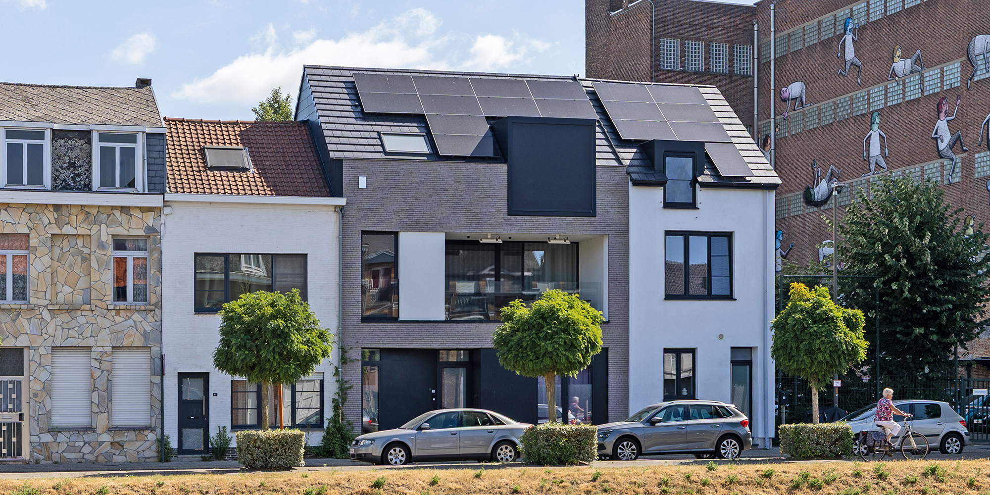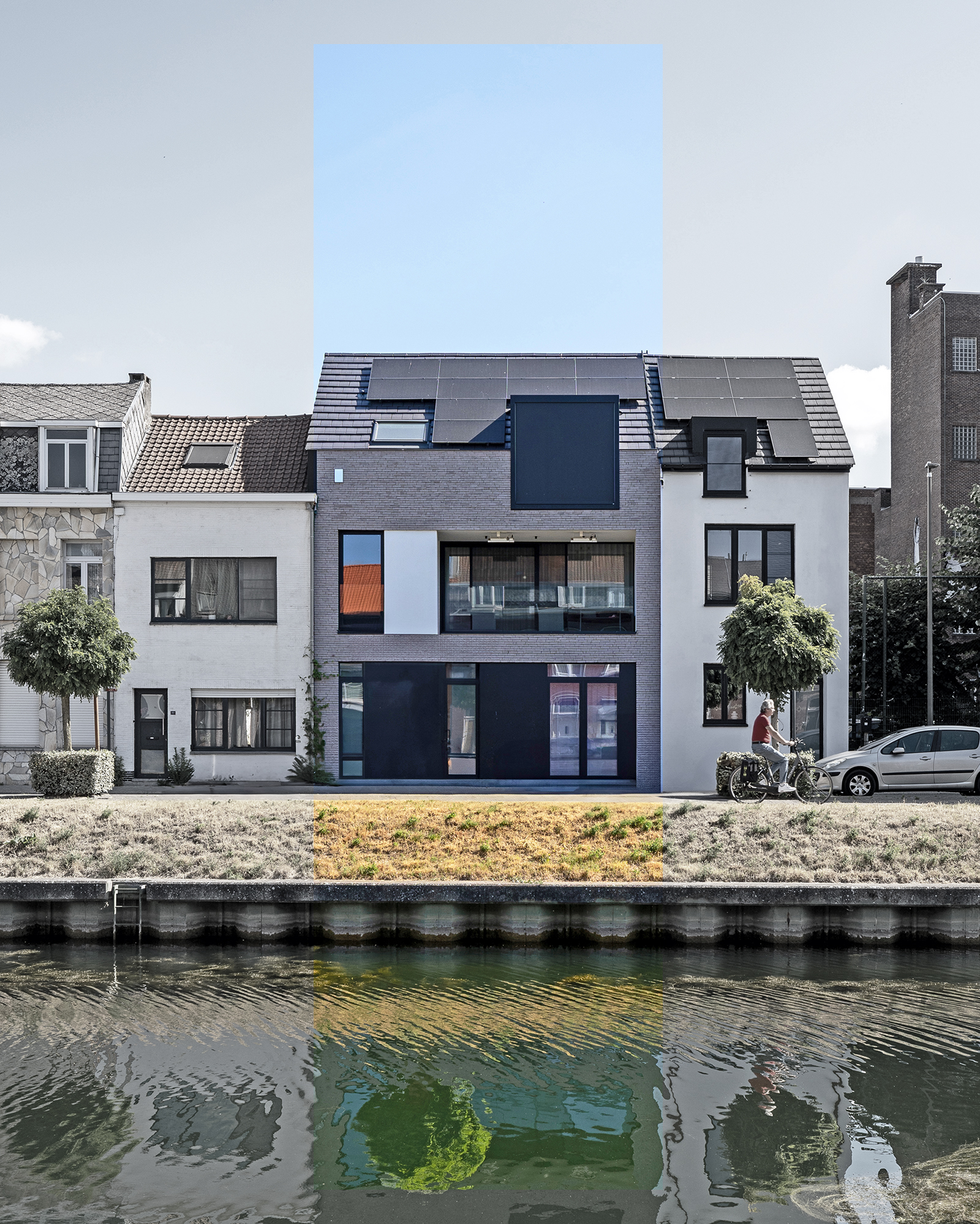 Langsheen 'de Leuvense Vaart' in Mechelen, niet ver van het centraal station, worden twee smalle rijwoningen gesloopt en vervangen door één nieuwe, ruime eengezinswoning. Aangezien de voorgevel op het zuiden is georiënteerd en eveneens een aangenaam uitzicht over de vaart geniet, werd er voor gekozen om het terras op de eerste verdieping aan deze gevel te plaatsen.